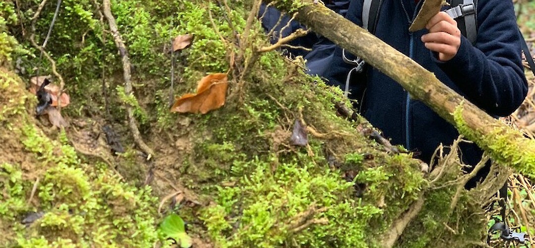 Zunächst ging es querbeet durch den Eichwald. Dabei zeigte der Lehrer, dass man zB junge Haselnussblätter sehr gut essen kann. Vorbei an einem umgestürztem Baum entdeckte die Klasse, dass aus dem Wurzelballen einige Knochen herausragten. Sofort war die Abenteuerlust der Jugendlichen geweckt, es wurde gesucht und gebuddelt und wie man sehen kann auch einige (Wildschwein-)Knochen gefunden.