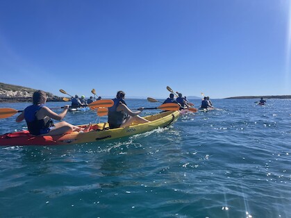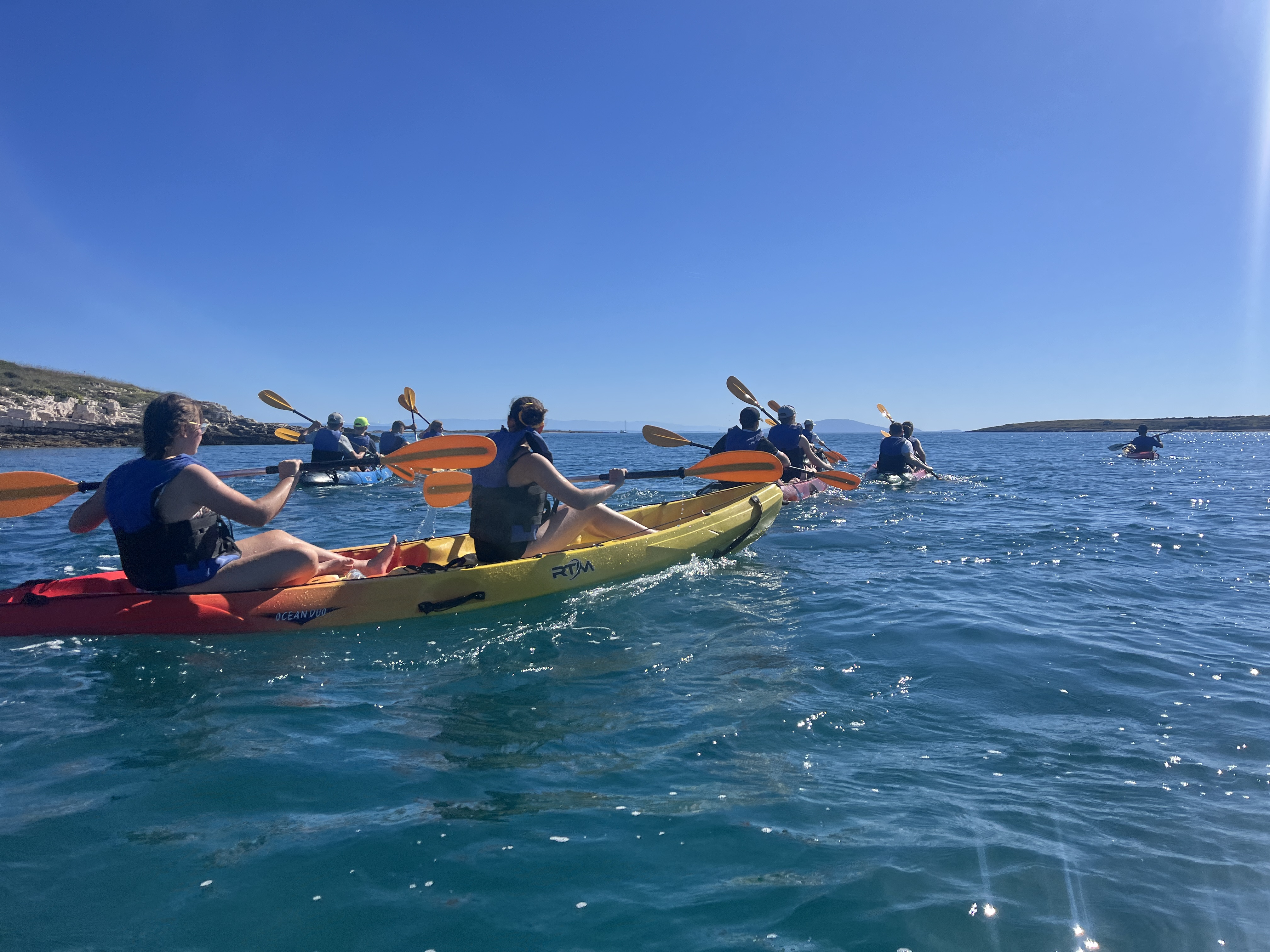 Donnerstag wurde es sportlich und abenteuerlich: Beim Kajakfahren entlang der Küste erlebten wir Natur pur – und auch ein bisschen Teamwork auf dem Wasser. Danach ging es in eine Tropfsteinhöhle, die mit ihren faszinierenden Formationen für Staunen sorgte.