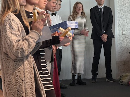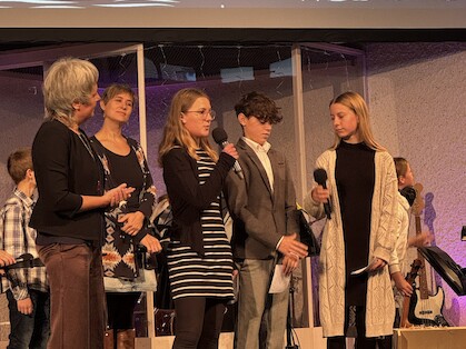 Dann traten unsere beiden Schülersprecher Lina, Ben sowie Emmi nach vorne, gemeinsam mit Annette Müller, die den Gottesdienst vorbereitet hatte. Ihre Begrüßung war schlicht – und gerade deshalb so stark.