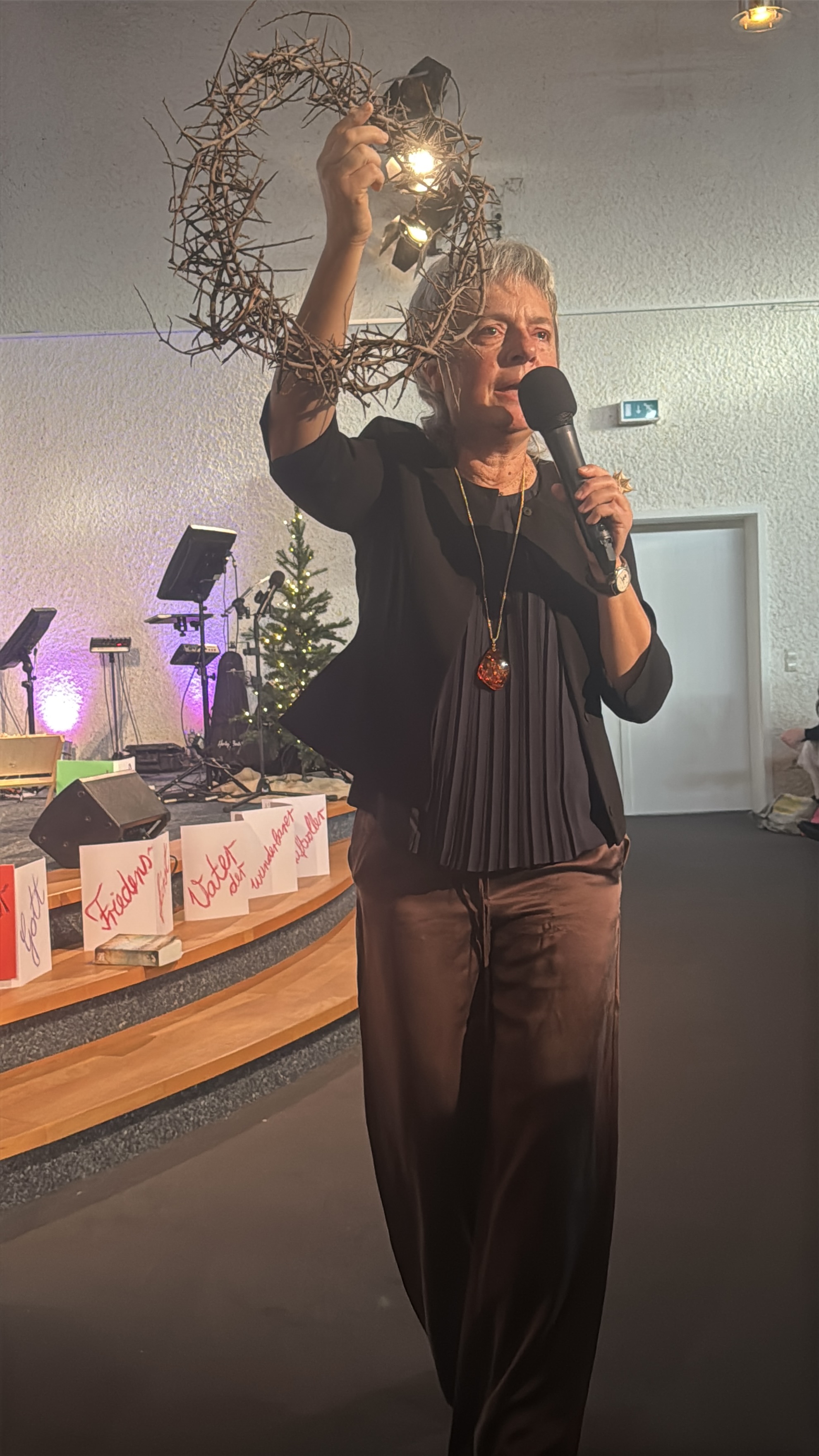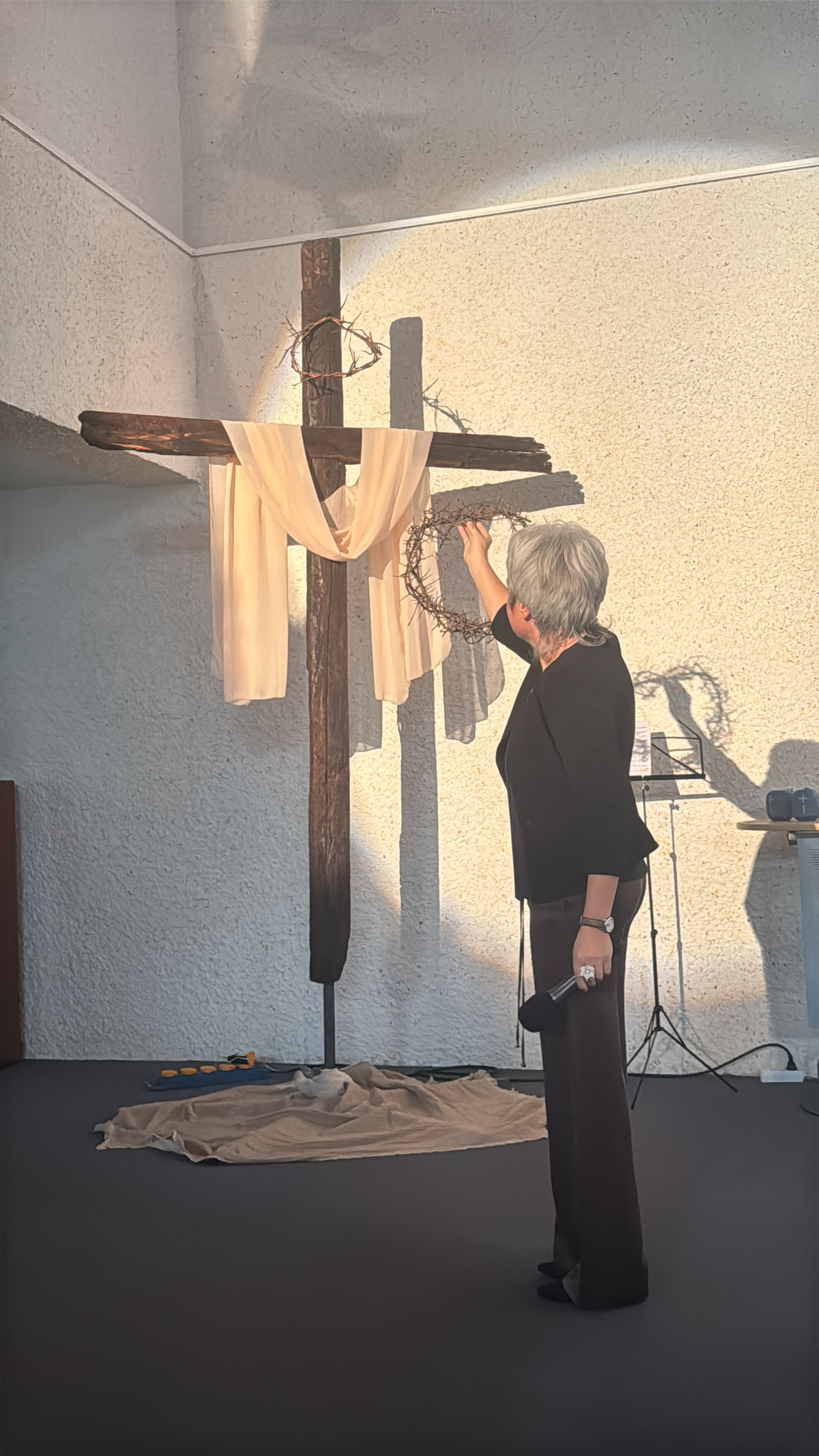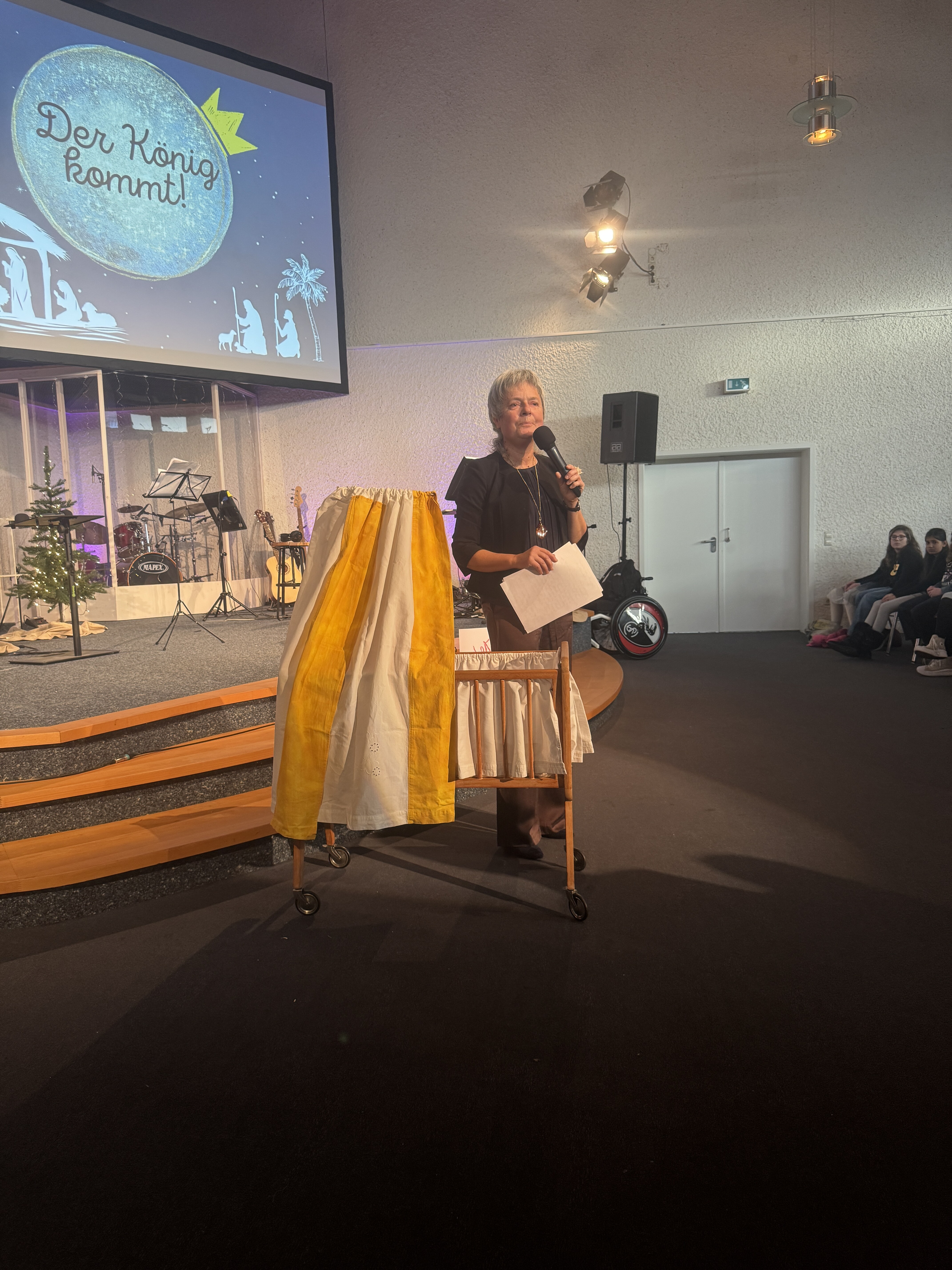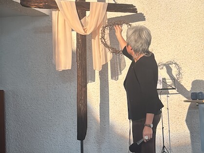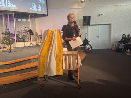 Als Annette Müller zur Andacht nach vorne kam, zog sie eine kleine Babywiege hinter sich her. Daneben Symbole: ein Herz, eine Dornenkrone, Nägel.